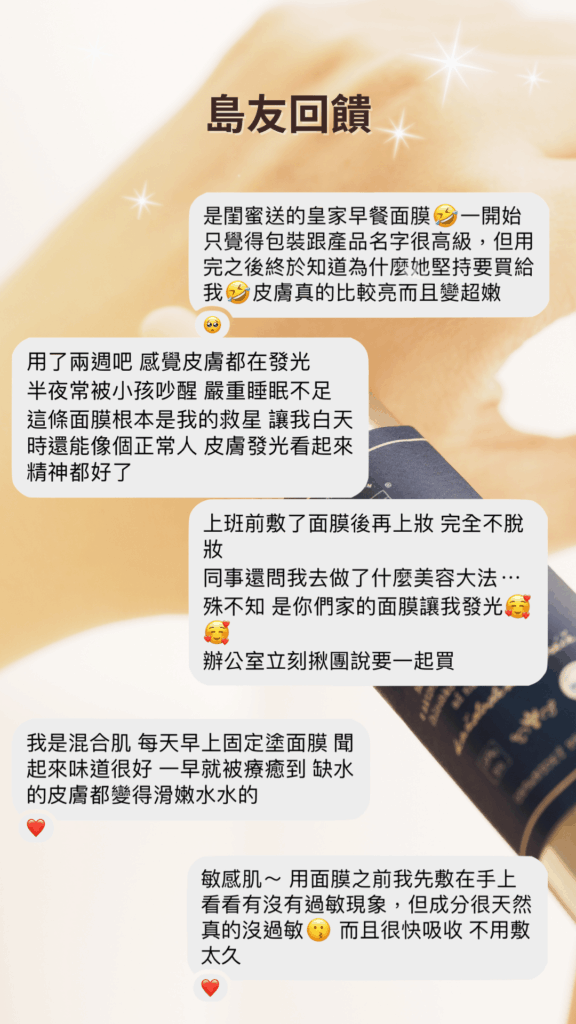 全成分資訊:Aqua, Persea Gratissima Oil, Isoamyl Laurate, Glycerin, Propandiol, Sorbitan Olivate, Cetearyl Olivate, Polyglyceryl-10-Laurate, Cetyl Alcohol, Glyceryl Stearate, Saccharide Isomerate (PENTAVITIN®), Hippophae Rhamnoides Fruit Extract, Royal Jelly, Tocopherol, Sodium Levulinate, Sodium Anisate, Caprylyl Glycol, Alcohol, Sodium Benzoate, Potassium Sorbate, Xanthan Gum, Sodium Phytate, Sodium Citrate, Citric Acid, Citrus Grandis Peel Oil, Salvia Sclarea Oil, Limonene, Linalool